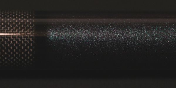 最後に塗装の印象を少し。写真は新鋭の元竿の表面を拡大して撮影したものです。ラメ塗装が施されており、見る角度によってブルー、グリーン、パープルと微妙に色が変化します。正面からでも粒子の違いが分かりますが、快晴の釣り場で太陽を浴びたときに、どのように輝くのか想像するだけで気分が高まります。