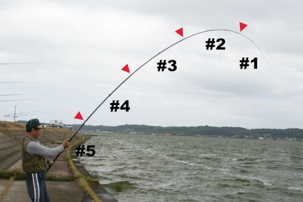 実際にこの竿で青魚を掛けたときの写真を見ていただくと、竿全体のしなり具合が一目瞭然です。竿の継ぎ目を赤い▼で示し、穂先側から順に#1~#5までの番号を付けました。ご覧のとおり、#1と#2が大きく曲がっており、#3以降は比較的ゆるやかなカーブ。小笠原が明確な先調子であることが、見た目にも分かる好例です。
