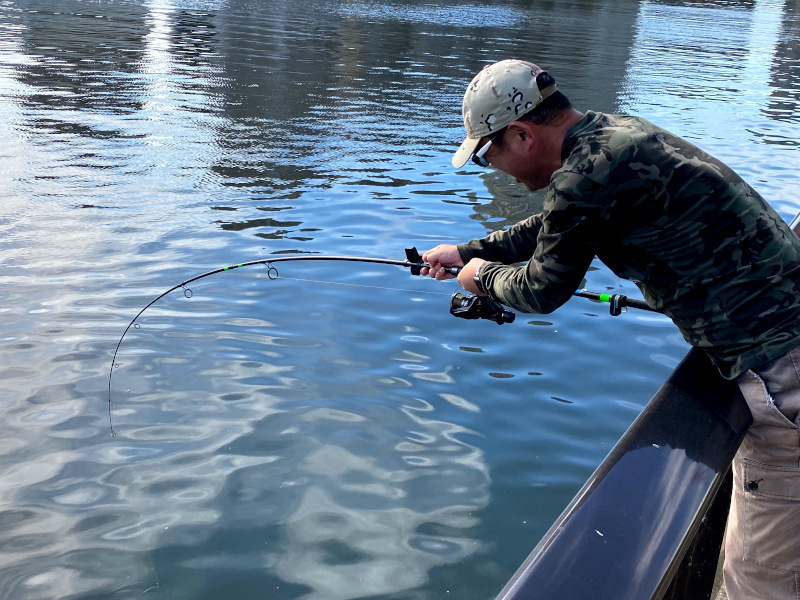 最初に当たりが出たのはこぶちゃん。タイドグラフから、当たりは午後に集中するかと思っていましたが、お昼前に来ました。幸先の良い一本に、表情がほころぶこぶちゃん。