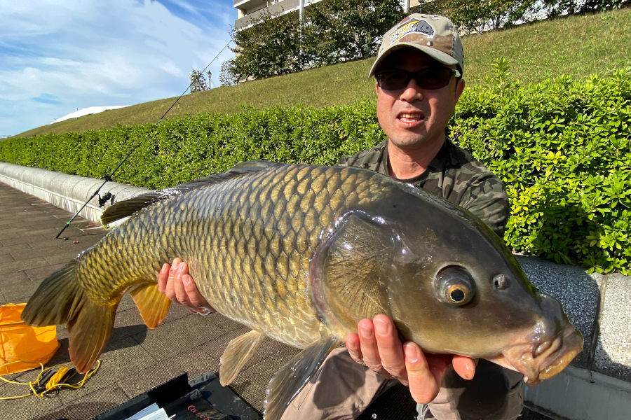 さて、楽しいランチタイムの後は、いよいよ本日のゴールデンタイムです。今か今かと待っていると、ぼらひでさんのアラームが響きます。コーン・ポタージュのボイリーの竿です。3人が見守る中でぼらひでさんのファイト開始。初めは軽めの手応えに見えましたが、一瞬掛かりに入られて冷や汗。立ち位置を変えて引き出してファイト再開!今度は何度も足元の護岸の凹みに突っ込んで来ます。ラインは20lbですが、コンクリート護岸に触ったらひとたまりもありません。必死で竿を突き出して浮かせようとするひでさん。緊張の中でタモを構えるこぶちゃん。声援を送るエルボさん。何度か浮き上がって横になったところで、サッとネットイン!素晴らしい隅田川の鯉に、おーっ!という声が上がります。ぼらひでさんも、久々に鯉を持って撮影!コロナの間、オフ会をやっていなかったから仕方がないね!嬉しい、嬉しい、重量級の鯉でした。