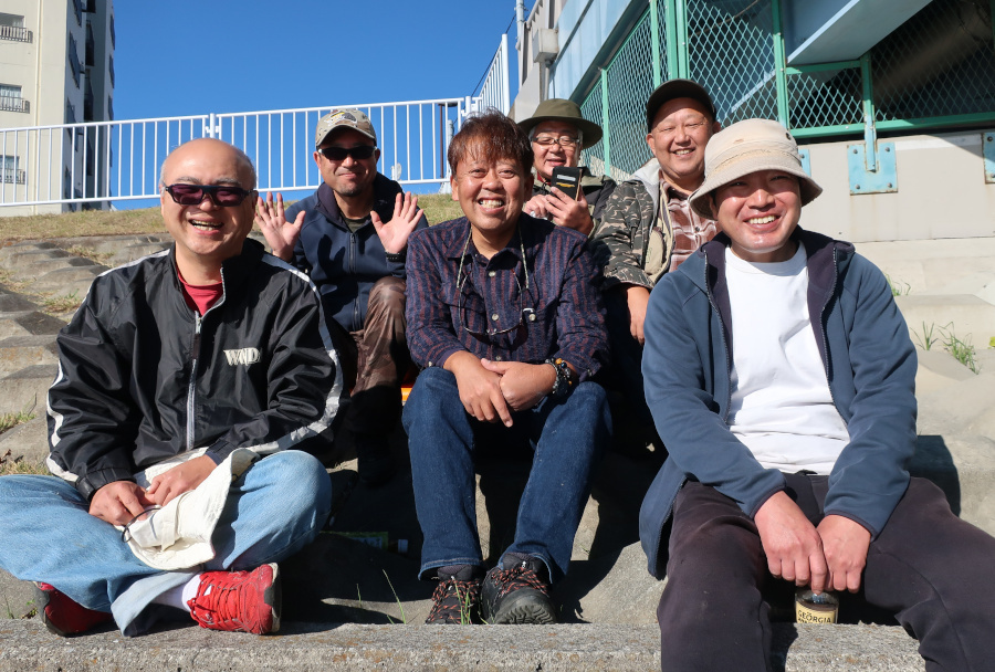 私が竿をセットして落ち着いた後、早めに集合写真を撮ることにしました。というのも、天気は終日いいようですが、午後から風が強くなりそうとの「こぶちゃん予報」がでました。並継のこぶちゃんはMCFの天気予報担当です。それじゃあということで、護岸に並んでハイ!チーズ!!ちなみに今回からカメラを変えたので、スマホからシャッターを操作できるようになりました。初め固かったみんなの表情が、冗談を言いあいながら何枚か撮っているうちに、ご覧のような楽しい写真になりました。みなさん、いい笑顔です。