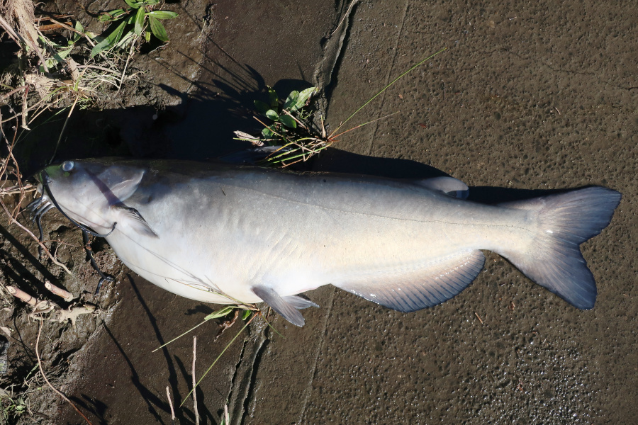 写真撮影をした直後、上流側にセットしたアラームが鳴りました。急いで駆け寄り、ファイト開始!・・・と思ったら、何やらちょっと違う感じのようです。上がって来たのは、ナマズくん。水郷でいつも見慣れたいいサイズ(笑)誰が釣ったのかって?それは個人情報ですので秘密です(爆)それよりも、中川にもナマズが進出して来たということは、近隣の河川に広がるのは時間の問題かもしれません。そうなってほしくないのですが・・・