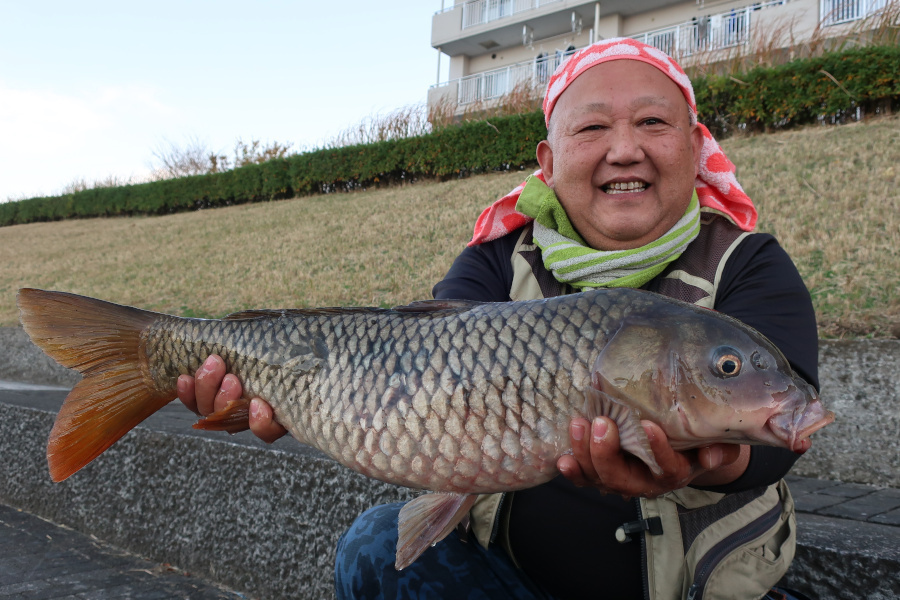 と、ぼらひでさんが突っ込む中、エルボさんはにこやかに記念撮影。オフ会レポートの中で時々書いていますが、MCFオフ会ではサイズによらずに鯉を持って撮影することが慣例となっています。記録級以外の鯉は、お二人とも普段は即リリースしていますが、今日は快く持って撮影してくださいました。