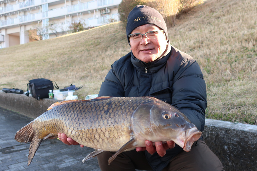 今日は9時頃に当たりが期待できるとのこと。その時間が近づくと、本当に私に当たりがありました。しかし妙に軽〜くリールを巻けるので、「やっちゃったか?」と思いましたが、紛れも無い鯉でした。ほっとしたのも束の間、オフ会のルールで手に持って撮影が待っています。「笑顔がないよ〜!」とかヤジが飛ぶ中、なんとか撮影を終了。次のあたりを待ちます。