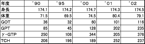 95年頃は、医者に「よく生きていたねぇ・・・」と言われるほどの大病をしまして、ちょっとだけ節制しておりました。各数値とも順調に増えていますね、見事な成人病予備軍・・・いやすでに成人病なのかも知れません。