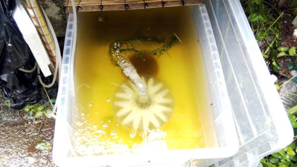 67リットルのコンテナを大型水槽として使うことにしました。この水槽なら魚体が15~20センチまで大丈夫でしょう。濾過機は「水作ジャンボ」という商品で、直径が20センチもある超大型です。一週間くらいかけて水作りをして、孵化から50日目に大きな容器に引っ越ししました。水が合うか心配でしたが、一晩経っても気持ち良さそうに泳いでいるので一安心です。しかし人が近づくと奥の暗い所に隠れてしまいます。水は薄茶に写っていますが、実際には緑色です。濾過バクテリアが増えれば、徐々にクリアになると思います。