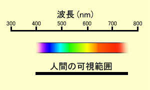光とは電磁波の一種です。携帯電話やテレビの電波の仲間ですが、これらに比べて周波数が100万倍くらい高いのが光です。目に見える光の場合の周波数は、数百テラヘルツ(THz)帯です。また「波」と呼ぶ以上は水と同じように山谷の振動があり、一周期(例えば山と山の間隔)を波長といいます。図に示すように、波長は色と対応しています。人間の目で感知できる波長は、約400~760ナノメートルの範囲とされており、この波長帯域の光を「可視光」といいます。これより短い波長の光を「紫外線」、長い波長の光を「赤外線」と呼びます。1ナノメートル(nm)は、0.001マイクロメートル(μm)、つまり百万分の一ミリメートルです。光は超高周波数で超短波長の電磁波であることがお分かりになったでしょうか。