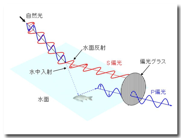 光の波は進行方向に対して垂直な方向に振動する性質を持っています。太陽から地上に降り注ぐ自然光も例外ではありませんが、進行方向に垂直ではあっても同じ方向に振動する光ばかりではなく、色々な方向に振動する光が混じっています。こうした自然光が水面に照射された途端に面白い性質を見せます。水面で反射しやすい光と、水中に透過しやすい光とに分離されます。反射しやすい光をS偏光、透過しやすい光をP偏光といいます。つまり偏光とは特定方向に振動している光の状態を言います。自然光のように振動方向がランダムである状態を無偏光と言います。