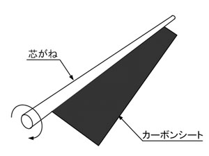 芯がねにカーボンシートの巻き始め端を加熱して仮止めした後、芯がね全体に圧力をかけながら転がし、シートをかたく巻付けます。