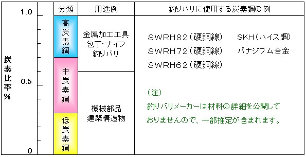 以上のことから、釣りバリは一般に高炭素鋼を使用していることが多く、特に「ハイカーボン」と表示されていなくても、金属学的にみて炭素量は多いものばかり使われています。