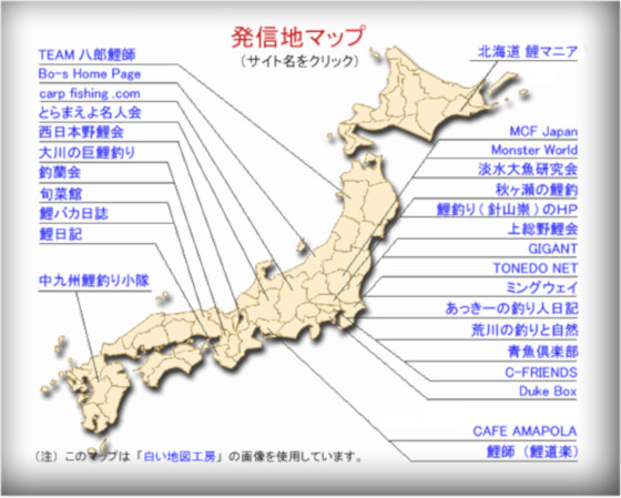 Monster World・C-FRIENDS・Bo-s Home Page・中九州鯉釣り小隊・旬菜館・淡水大魚研究会・あっきーの釣り人日記・ウワイドンのコイ釣り日記・鯉釣り(針山崇)のホームページ・上総野鯉会・秋ヶ瀬の鯉釣・鯉日記