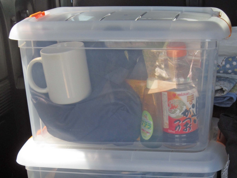 次に収納についてお話します。第1回で述べた通り、ラゲッジ床下に釣り具、クッキング用品、電子機器などとりあえず放り込んでみたのですが、釣り場で実際使ってみると改善すべき点が多々見つかりました。その中でも大きな改善点は、クッキング用品と食料をベッド枕下のプラスチックケースに全て収納した点です。一方ラゲッジ床下の空いたスペースを利用して、釣り具、照明・電子機器をここに集約しました。考えてみると、用途ごとに収納場所を分けるのはごく当たり前のことでした。