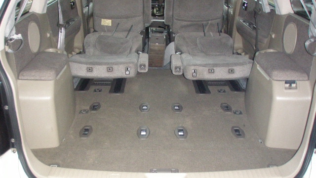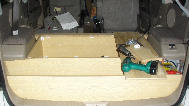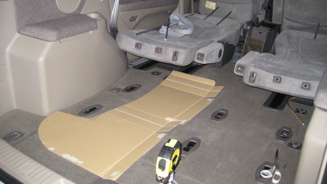 次はいよいよベッドの製作に取りかかります。サードシートをはずしてセカンドシートを倒した状態で、カーゴスペースに基礎構造を作ります。床板の型取りのために、段ボールを使って隅の曲線部分も丁寧にうつし取ります。サードシートを固定していた床の金具は丈夫なのでそのまま残し、床板を安定させるのに利用します。基礎構造は、収納部を引き出しタイプにし辛い車であるため、床下収納タイプとしました。基礎構造の高さは、セカンドシートを倒した高さよりもギリギリ高い程度にし、ベッド面から天井までの高さをできるだけ確保するように配慮します。