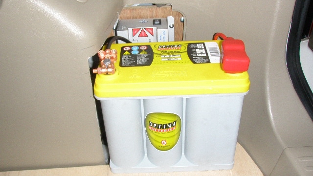 サブバッテリーは、OPTIMAの密閉式ディープサイクルバッテリーです。容量が41Ahですが、車内蛍光灯、センサー受信機、そして携帯の充電くらいしか使わないため、これでも十分過ぎる容量です。サブバッテリーチャージャーを付けて走行充電可能にしました。