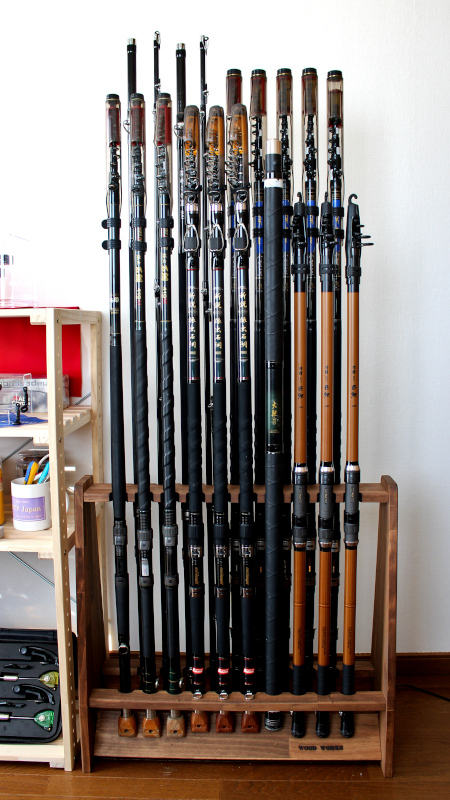 最初はロッドから。お決まりのロッドスタンドですが、これは表裏に合計19本立てることができます。奇数の理由は、表裏で半ピッチずらして重ならないようにレイアウトするためです。細かい気配りが感じられます。