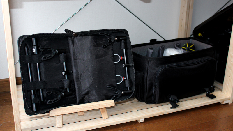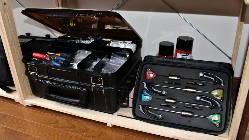 上の段にはアラームを置いています。左の黒いケースがバイトアラーム3個セット、右奥にヒットセンサーの発信機があります。バイトアラームは荒川オフ会用に購入しました。