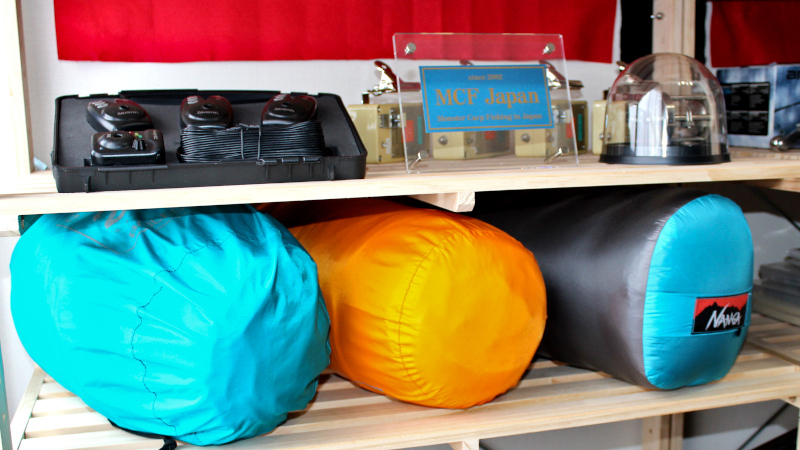 下の段はスリーピングバッグ3種類です。左ふたつがPAINEブランド、右がNANGAブランドの商品(詳細はこちら)です。真ん中の黄色が最も気温が高い時用で、右が気温が低い時用、左がその中間です。収納サイズだけみると同じくらいですが、使ってみると全く別物と言っていいくらい違います。フルシーズン万能なものはないため、季節に応じて車中泊で使い分けています。