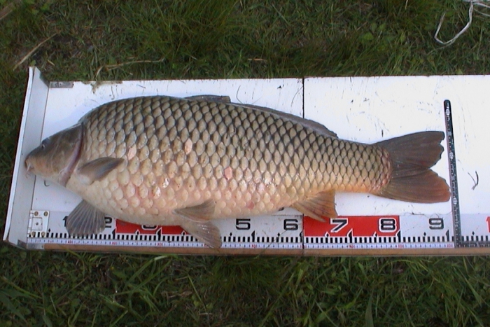 また背景ですが、鯉を強調するためには、できるだけ無駄なものを入れないようにした方が無難です。この写真ではシートを敷いていますが、これは鯉が暴れて検寸台から落ちても、鯉を傷つけないように保護するためのものです。小さ目のレジャーシートで十分ですし、ブルーのシートだと写真の見栄えもいいと思います。シートを使わない場合は短い草の上に検寸台を置いて撮影すると写真の見栄えと鯉の保護のためにいいでしょう。間違っても周辺にゴミなどを写さないように注意してください。せっかくの楽しい思い出が台無しになります。