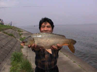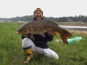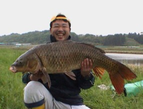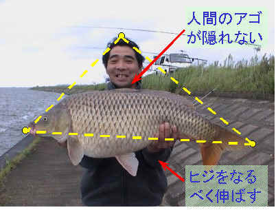 しかしこれは度が過ぎるとむしろギャグになってしまい、お笑い写真になりますので注意しましょう。写真はかつて地鶏オヤジさんが釣った子鯉を「メーター級に撮ってくれ!」といって突出した写真ですが、やはりいくらなんでも限度がありますよねぇ(^ ^; 笑って許してやって下さい。