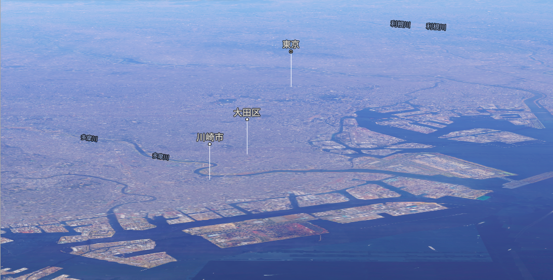 多摩川流域(Googleより引用):東京都大田区と川崎市の間を流れる