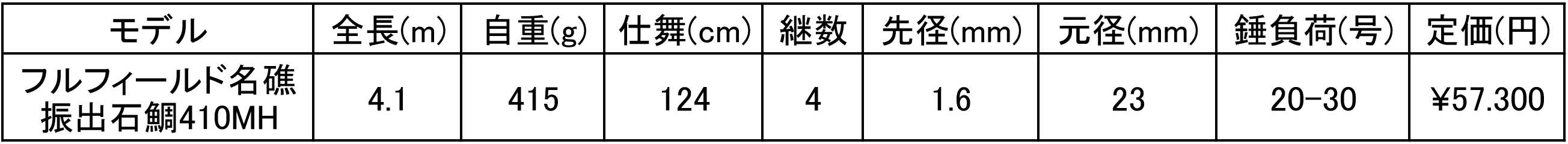 1995年から発売された竿です。名礁シリーズ25種類の竿の中で、最も短いのが410MHです。この竿以来4.1mは販売されていませんので(2008年現在)、私にとっては極めて貴重な竿といえます。フルフィールド振出石鯛410Mに比べると、外観は圧倒的に美しく、高級感があります。また元径23mmが示すように、非常に細身で軽く作られています。