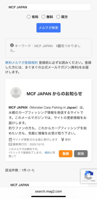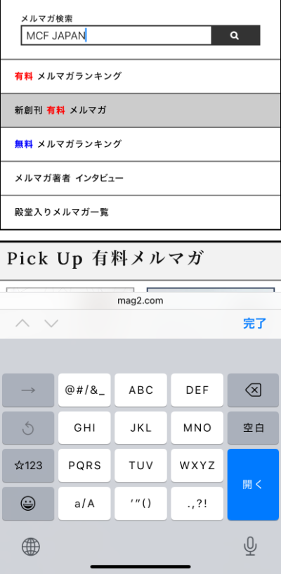 「まぐまぐ!」のホーム画面に戻り、検索ウィンドウに「MCF JAPAN」と入力して検索してください。