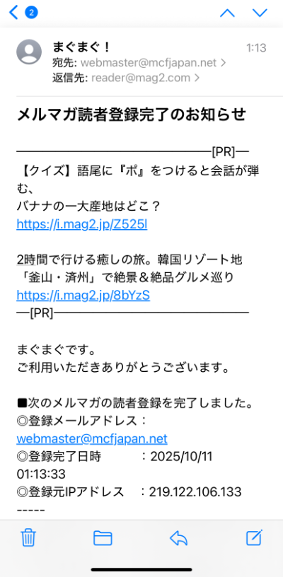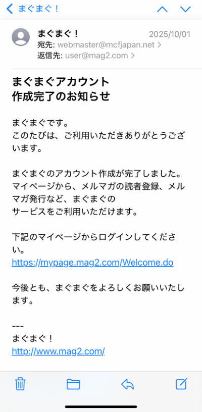 しばらくすると「まぐまぐ!」から登録完了メールが届きます。