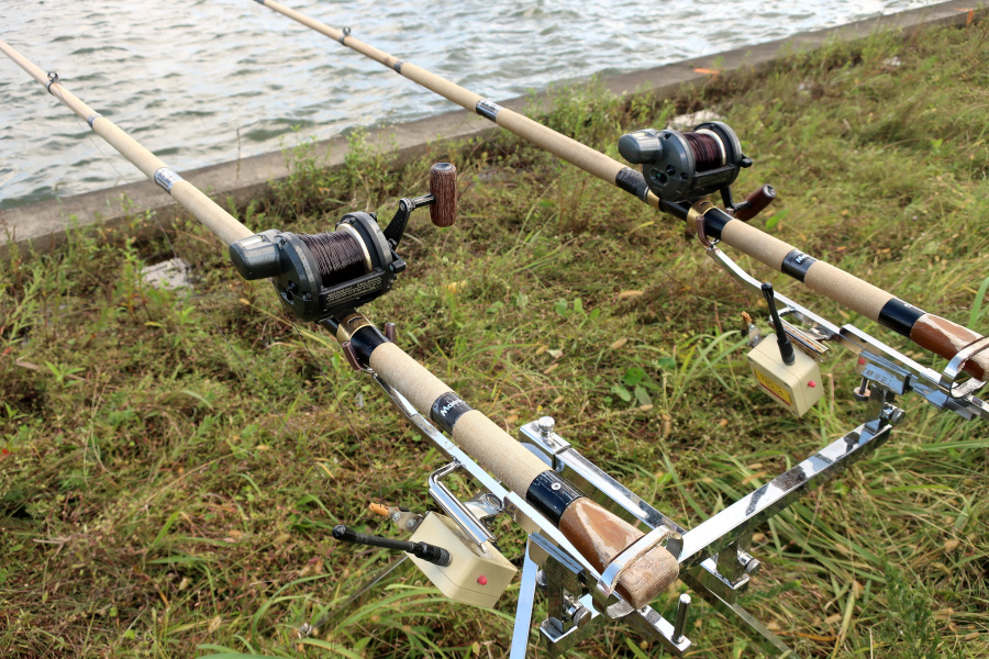その後は、水辺に並んだ数々のタックルを工事長さんとブッコマンダーさんが紹介してくださいました。名竿や名機と呼ばれるベイトタックルが一堂に揃う光景は、今や大会ならではのもの。皆さんはアオを狙っておられ、ライン16号前後のヘビータックルが並んでいました。