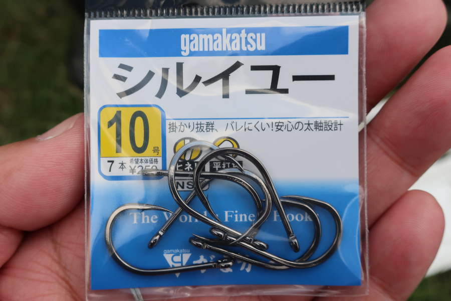 さらに、以前から気になっていたがまかつのフック「シルイユー」も拝見。シルイユーとは、沖縄など南方に生息する「シロダイ」のことです。ワイドゲイプで太軸のフックでしたが、思っていたよりも小ぶりで驚きました。考えてみればフエフキダイの仲間で、クロダイに近い口のサイズですから納得です。サイズ感はチヌ針に近く、形はむしろ伊勢尼系統に近いかもしれません。どちらにしても、実に使いやすそうなフックだと感じました。すでに手元には一生分のストックがありますので購入は控えていますが、いつか試してみたい一品です。