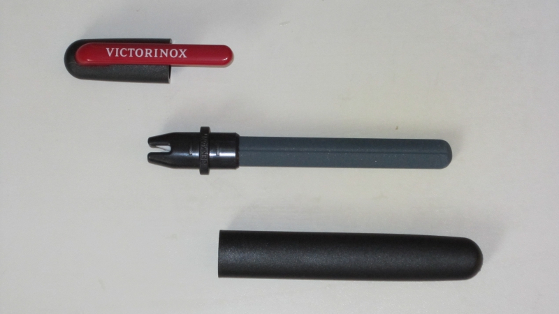 ペン型のシャープナーです。写真はケースからシャープナー(中央)を取り出した状態で、V型とスティック型二種類のシャープナーが付いています。