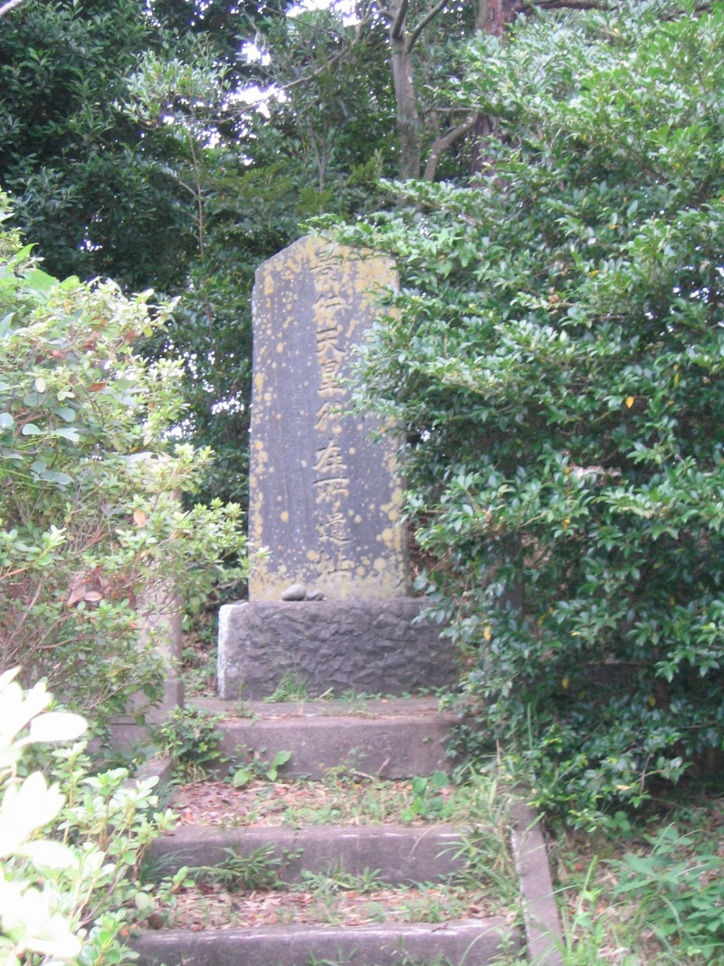 看板を左手に見ながら細い数十段の石段をのぼりきったところに、 こんもりと生い茂る木が立っていました。そこから左手に続く小道のすぐ先に、景行天皇行在所遺跡の石碑が木々に隠れるように立っています。二千年近く前に、この小高い丘に滞在された天皇は、いったいどんな気持ちで1ヶ月間を暮らしたのでしょうか。80人の子を持った天皇ですが、その中でも特に大役を命じた日本武尊の死の悲しみはいかばかりだったでしょう。日本書紀の中にもその悲しみの様子が伺われます。
