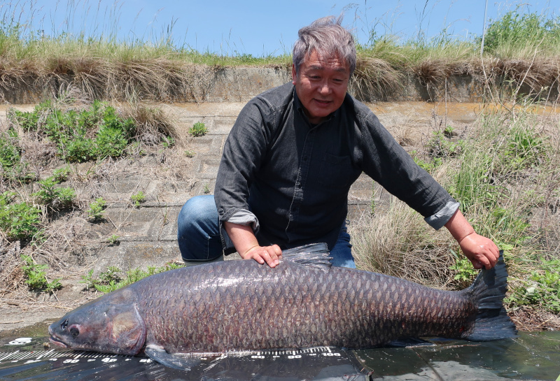 I took my time to bring up the prey that didn't come up easily, without forcing it. The moment I saw the dorsal fin, I was certain it was an Black Carp. It didn't look that big when it was far from the shore, but as I brought it closer, my estimation improved. Maybe around 140 centimeters?