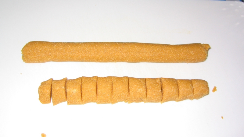適量を取り出してまな板の上で転がしながら棒状にします。太さは作りたいボイリーの径と同じ程度にします。さらにナイフで切って丸めやすくします。