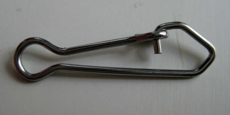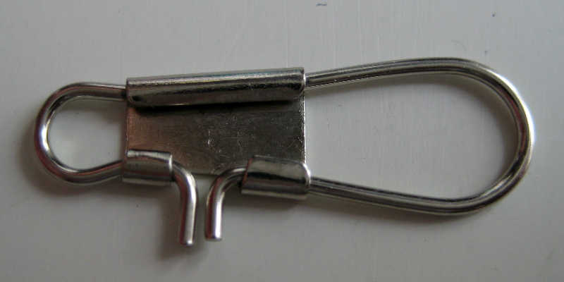 錘の連結に使っています。本来はルアー用で、小型軽量、1.5号で28ポンドの強度。錘に使ったのは、無理な負荷がかかった時に変形して錘が外れること、タモに引っかかりにくいことが理由です。小さくて強いスナップのため、慣れないと扱いにくいのが難点です。
