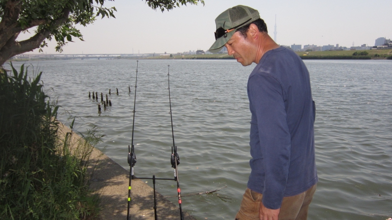 私は少し上流の橋脚付近に竿を出しました。底を探ってみると一帯に泥の感触のため、ポップアップを半分使って少し浮かせるように仕掛けをセットしました。ぼらひでさんが事前にこの場所を下見してくれましたが、その時は残念ながら鯉を見ることができなかったため、今回どの辺りが良いのか全く検討がつきません。誰も予想できないのも楽しみのひとつと捉え、最初の当りを待ちました。