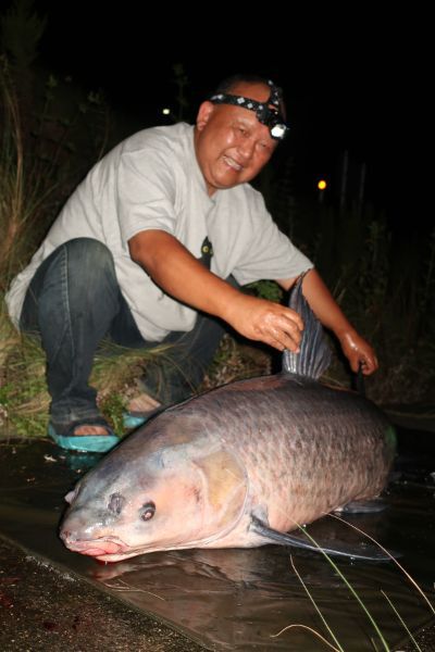 そしてついにこぶちゃんから受け取った受信機が役立つ時が来ました。時刻は0時前。竿はさっき反応があった3番です。急いで駆け寄ると、こぶちゃんがやり取りを始めています。「乗った?」と聞くと「アオ!!」という返事。こぶちゃんのタモを取り、気をつけて護岸を降りていきます。ヘッドライトで湖面を照らし状況を見守ります。最初にアオが顔を見せた時、「ちっちゃいな!」とこぶちゃん。「いやいや、結構でかいよ!」と私。そうです、水中では比較対象がないので実際よりも小さく見えるのです。