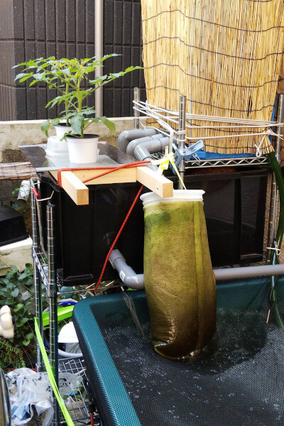 先にお話した水耕栽培は、2段目の生物濾過槽の水を吸わせています。