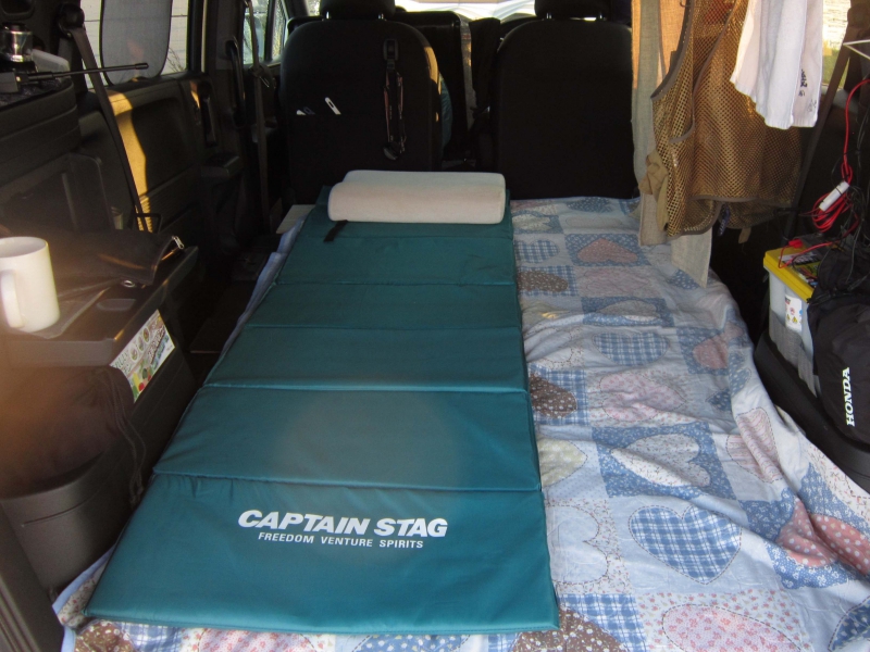 第2回でお話した通り、フロントのシートを前にスライドさせて空いたスペースにプラスチックケースを2個置き、その上に板を敷きました。できたベッドが写真の通りです。布を全面に敷き、その上にキャンピングマットを置きました。就寝時はシュラフに入ってこの上に寝ます。実は厚めのエアマットをネットで調査していたのですが、購入前に連休になってしまい、仕方なく物置の奥に仕舞われていた10年以上前のマットを引っ張り出してきた物です。厚さは1.5cmしかありませんが、これで車の凸凹を十分吸収してくれました。つまりそれだけこの車がフルフラットにできているということです。いずれ時間に余裕があるときに、もっと寝心地のいいマットを購入したいと思います。