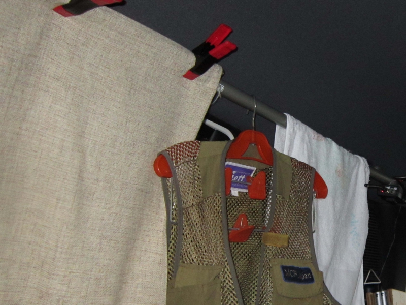 この車の内装で便利なもののひとつが、ルーフインサイドレールです。後部座席からラゲッジにかけて左右についている太めのバーです。タオルやハンガー掛けとして使ったり、カーテンをクリップで止めたり、センサ受信機をマジックテープで止めたりと様々な用途に対応できます。カーテンもまたこの車に合ったものをネット検索していたのですが、釣行に間に合わなかったので応急処置的にクリップで使ってみました。車中泊釣行の頻度が少ないことから、当面はこのままでも良い気がしています。