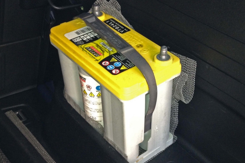 今回は車中泊の必需品であるサブバッテリーについてお話します。私の場合はバイトセンサの受信機用電源とモバイル機器の充電に使う程度ですので、38Ahのオプティマ・イエロートップYT-B24Lを選びました。このバッテリーなら、フリードスパイクのリヤタイヤハウス部にあるサイドポケットにすっぽり入るため置き場所に困りません。走行中にがたつかないように、100円ショップの滑り止めマットを敷いてバッテリーを入れました。また先代の釣行車は走行充電ができるようにしていましたが、今回はあえてそうしませんでした。充電のためにバッテリーを車から下ろすことにはなりますが、フル充電できることを重視しました。