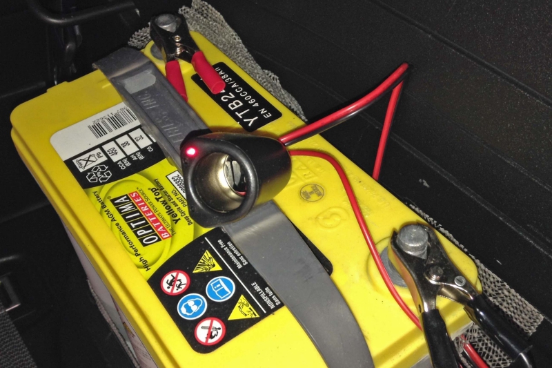 次にシガーソケットの接続です。できるだけ簡単に付け外しできるように、ワニ口クリップ付きシガーソケットを選びました。ソケットは1個しか付いていませんので、さらに2連か3連のソケットを繋いで使うことになります。さらに、安心のためにバッテリー電圧計を使用します。これは長年愛用したものを先代の車から外してリユースします。NAPOLEX Fizz-790は、電圧計の他に電波時計と気温計がついています。