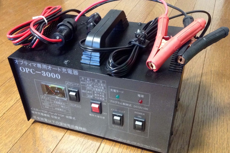 最後に充電器についてお話します。今回購入したのは、オプティマバッテリー専用オート充電器 新OPC-3000V3です。ネット情報を検索したところ、他社のものよりも価格が少し高い代わりに安心して使えそうでしたのでこれを選びました。バッテリーと合わせて決して安い買い物ではないのですが、釣り場でバッテリートラブルがないように品質を重視したつもりです。