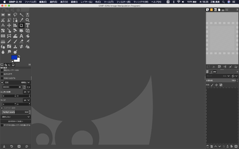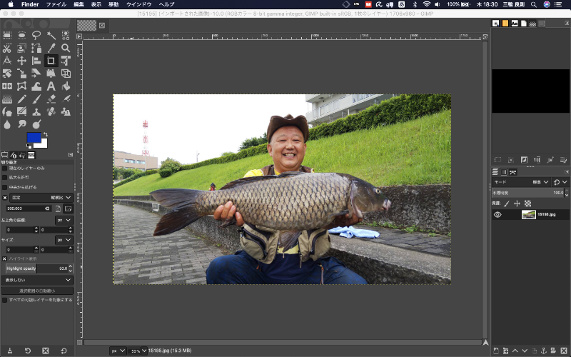 画像左下の表示%をプルダウンで選んで大きくし、画面左のメニューの中から投げなわマークの「自由選択」を使って残す画像のエッジをクリックしていきます。選択を一周して戻ったら最初のクリックと重ねて黄色ドットが表示される状態でダブルクリックし、さらに忘れずにENTERキーを押します。すると選択範囲が確定して線がギラギラします。レイヤー/透明部分/アルファチャンネルの追加をクリックし、次に選択/選択範囲の反転をクリックします。この操作で背景側が選択されますが、画面上は先ほど選んだエッジの線がギラギラしているのに加え、画像全体の四角の枠が同時にギラギラすることで判別できます。(選択している範囲を別途表示させることもできますが煩雑になるため説明を割愛します)次に編集/切り取りをクリックすると背景が切り取られ透明になります。透明になると画面上は市松模様になります。