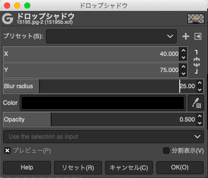 最後に影を作成します。たとえばインタビューボードのレーヤー1が被写体から近い背後であるとイメージします。さらに被写体の明暗から太陽光は左上から当たっていることがわかります。したがって影は右下に出ることになります。フィルター/照明と投影/Drop Shadowをクリックします。ドロップシャドウのウィンドウが表示されたら、XとYで影の位置、Blur Radiusで影のボケを調整してOKをクリックします。これでレイヤー4の完成です。