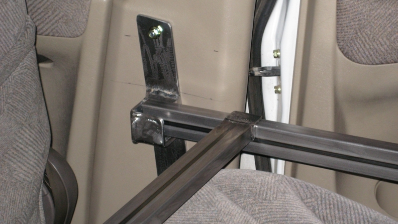 散々悩んだ挙句に、以下のようにしました。左右のセカンドドア内側に沿って前後に鉄フレームを渡します。これは、セカンドドアの前後の壁にブラケット(受け金具)を取り付け、鉄フレームを引っ掛ける構造です。この二本のフレームの間をつなぐように、運転席の背後付近で横断する鉄フレームをさらに取り付け、結局三本の鉄フレームで「コ」の字の構造をつくります。