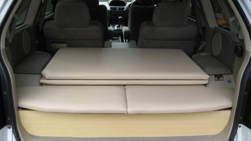 リヤを開けてベッドを確認します。運転席を通常のポジションにしたまま、長さ約1.9mのベッドが完成です。運転席、助手席を前にスライドすると、さらに広大なスペースが確保でき、靴など汚れた物を置くスペースとして活用できます。収納はベッドの床下ですが、竿、タモ、餌バケツ以外のタックルは、ほとんど収納することができます。