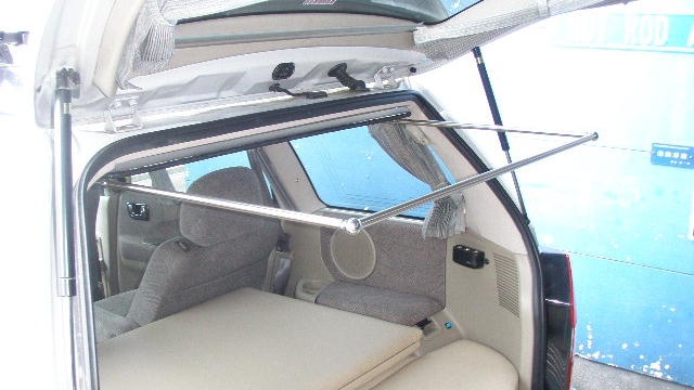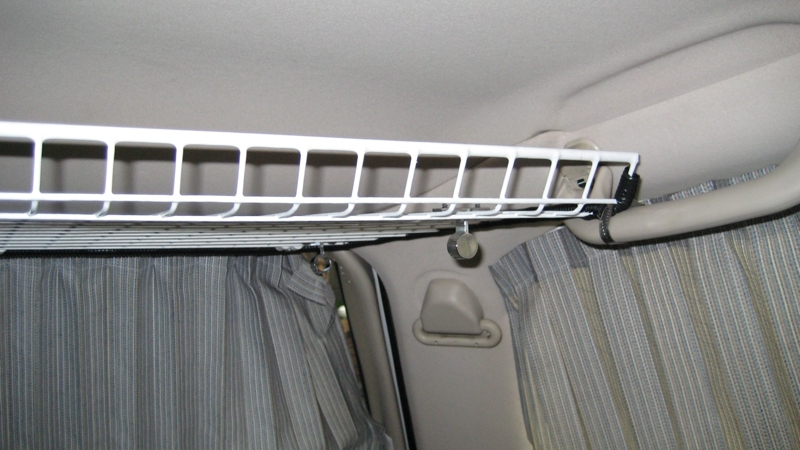 ネットを利用して、リヤカーテンレールも取り付けました。カーテンレールはステンレスパイプを組み合わせたものです。釣り場でリヤを開けているときだけ使うものなので、簡単に組立、分解することができます。ここに、どんなデザインのカーテンを下げるか思案中です。