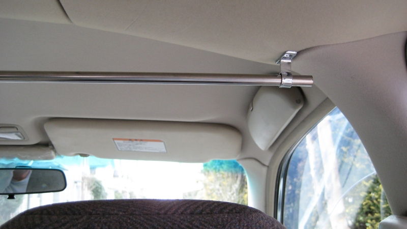 運転席とベッドの間を仕切るカーテンレールも付けられるようにしました。レールはリヤと同じようにステンレスパイプを簡単に付け外しできるようしてあります。仕切りカーテンは普段使わないときは邪魔になるため、着脱式にしました。ここのカーテンも現在思案中です。