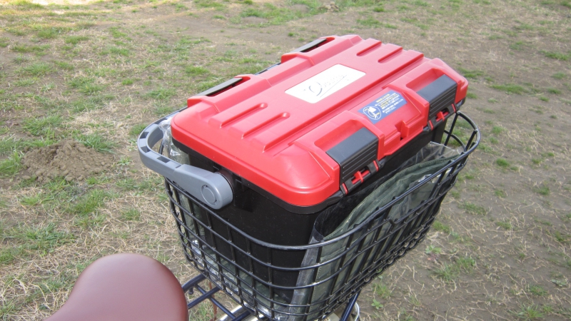 次に小物類と餌。以前はリュック型のシステムバッグを使っていましたが、自転車の場合はむしろ使い勝手がよくなかったため、電動工具用のツールボックスを使うようになりました。後のカゴにカープマットを先に入れ、そこにツールボックスを置くことで振動によるがたつきを軽減することができます。ツールボックスの中には、数種類の餌の他にリール、仕掛け類、折り畳みバケツ、カメラ、モバイル機器などを放り込んでいます。当りを待つ間椅子が欲しくなることが多いため、ボックスに腰掛けることもできます。また仕掛けなどの準備をする場合には、ボックスが作業台になることは意外に便利です。