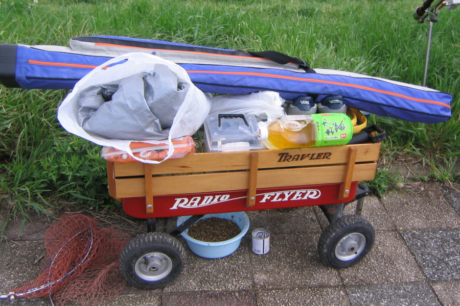 アメリカで長い歴史を持つラジオフライヤーの定番商品です。荒川などでタックルを担ぎ込みする時、このワゴンがあると便利です。移動時は長いハンドルを付けて引張ります。自分の好みでタイヤの付け替え改造をしていますが、オリジナル品でも十分です。